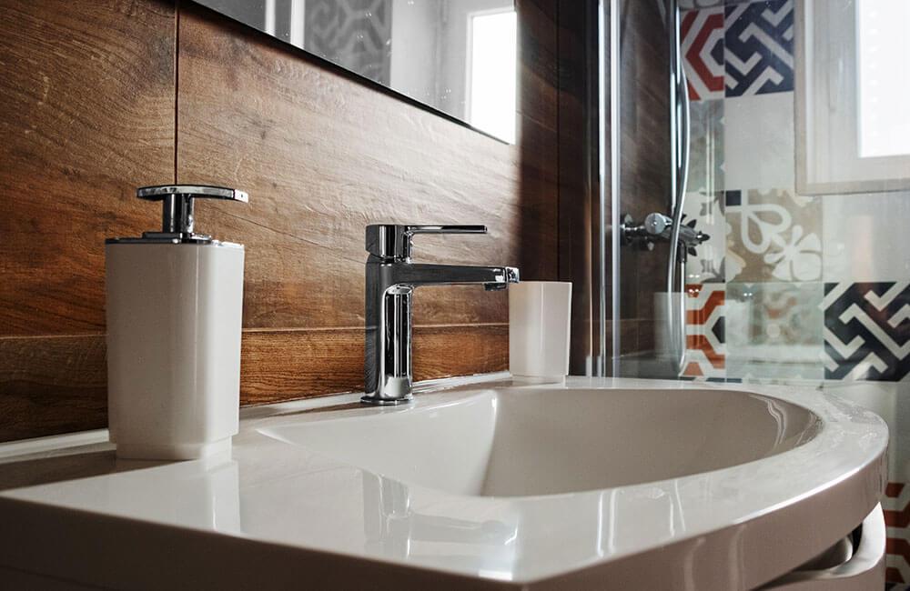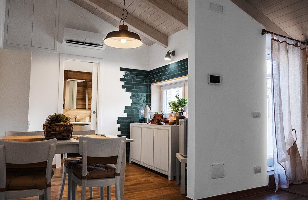 The stone, that is predominant in every room, has been highlighted by combining it with a wood effect stoneware with a warm coloration, covering the whole internal staircase and part of the bathroom environment. The bathroom is tied in turn with a coating of cement tiles.